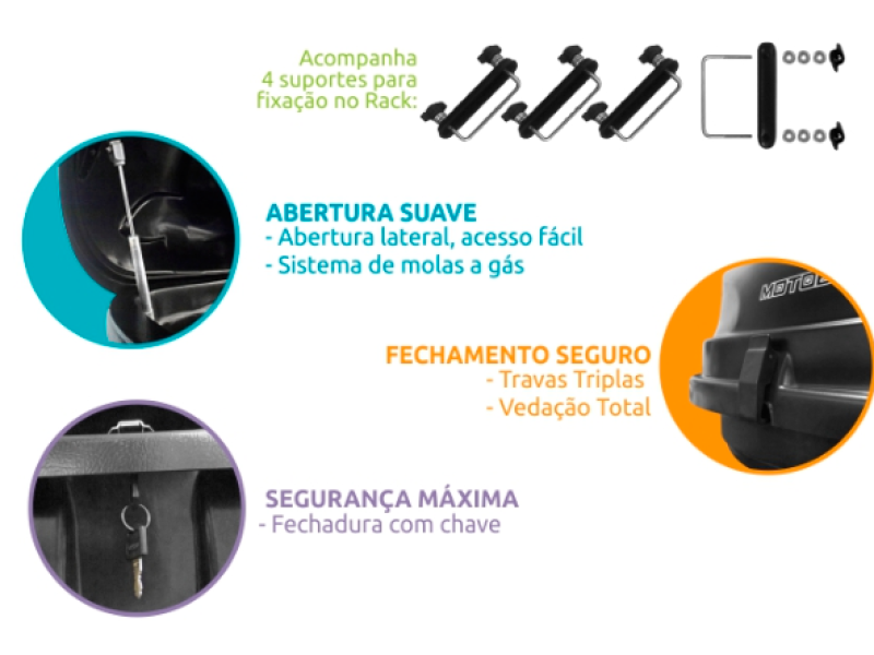 Fabricado em plástico ABS virgem com proteção UV, o maleiro Motobul é leve (apenas 10,6 kg) e possui sistema de abertura lateral com duplo amortecedor a gás, facilitando o manuseio. Seu sistema de fechamento com chave garante segurança, com cinco travas, sendo uma com chave. Disponível nas cores preta e cinza, combina com qualquer veículo e mantém o visual moderno.